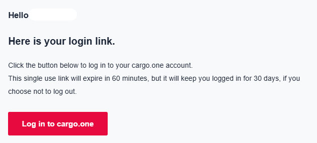 Click on the button 'Log in to cargo.one' - You can now log in for 30 more days by simply using your email and password 🚀
